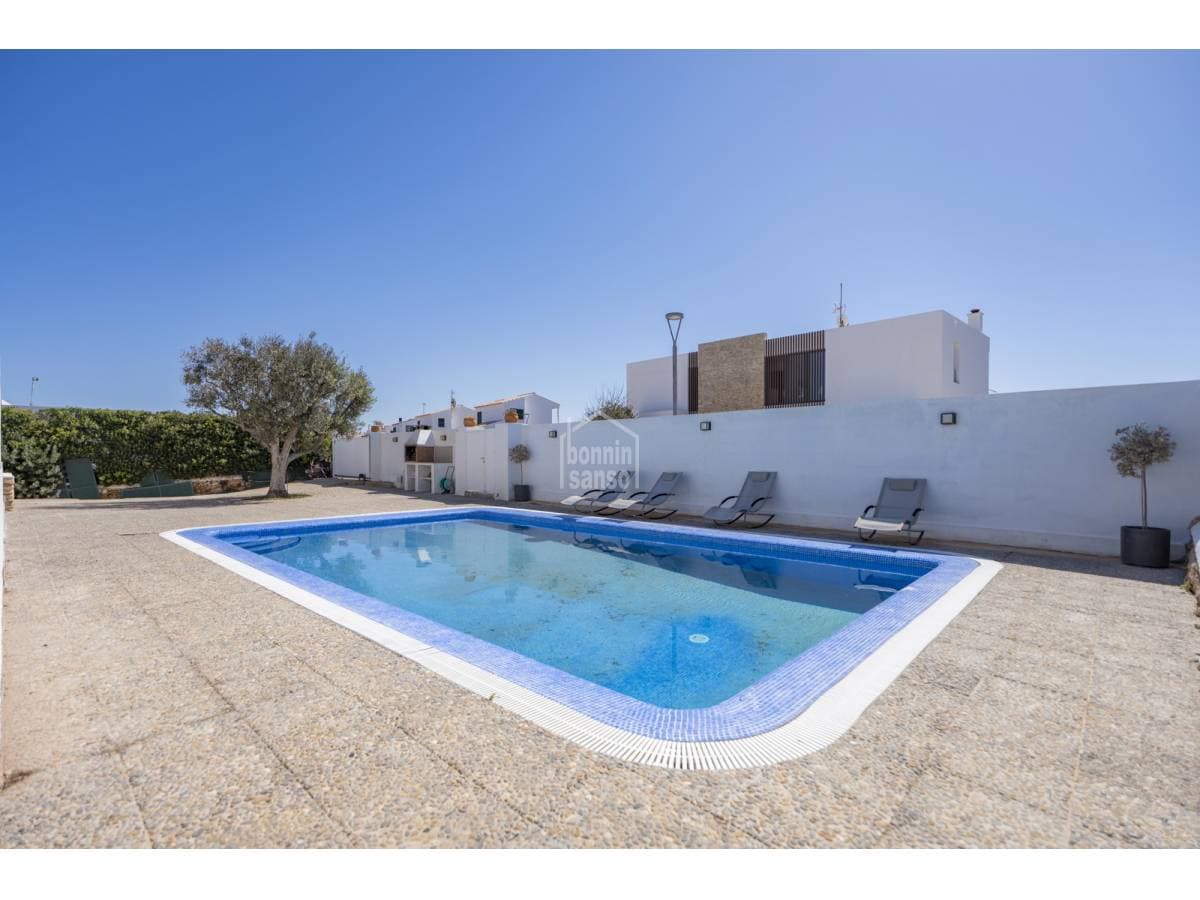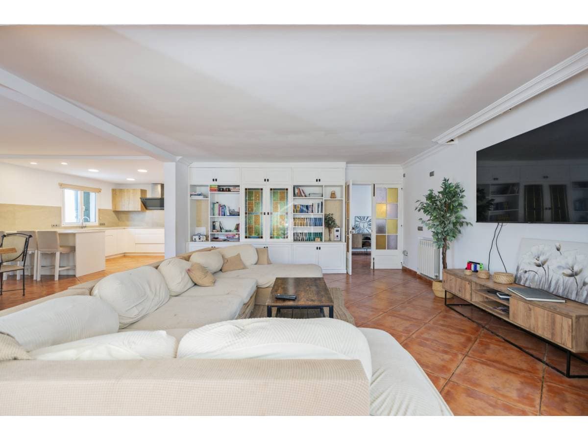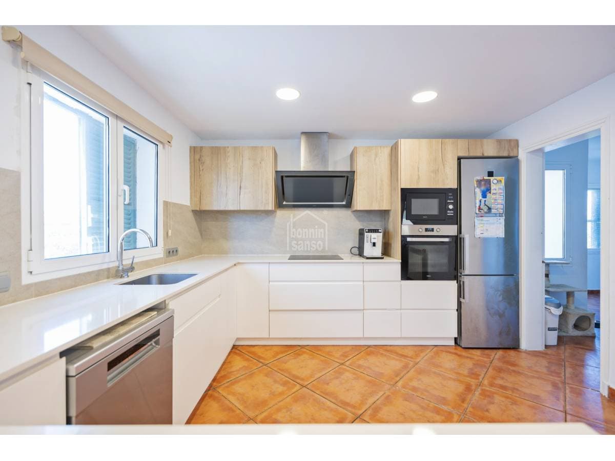 Located in a residential area of Cala'n Blanes, this villa stands out for its generous proportions, practical layout and the independence between its living spaces. It is an ideal option both as a year-round residence and as a holiday home. The main floor, offering over 200 sqm of built area, features four double bedrooms and three bathrooms, one of them en suite to the master bedroom. The property also boasts a spacious open-plan living and dining area with a fully integrated kitchen, providing direct access to the terrace and pool area. An external staircase leads to the upper floor, where an independent apartment with private access is located. It comprises a living room with open-plan kitchen, a full bathroom, a double bedroom and two terraces. The basement level includes a large garage of approximately 100 sqm, with space for several vehicles and additional storage. A modern aerothermal system and solar panels have recently been installed to enhance energy efficiency. The plot borders a green area and is situated approximately 200 metres from the sea. A versatile and well-located property offering multiple usage possibilities.