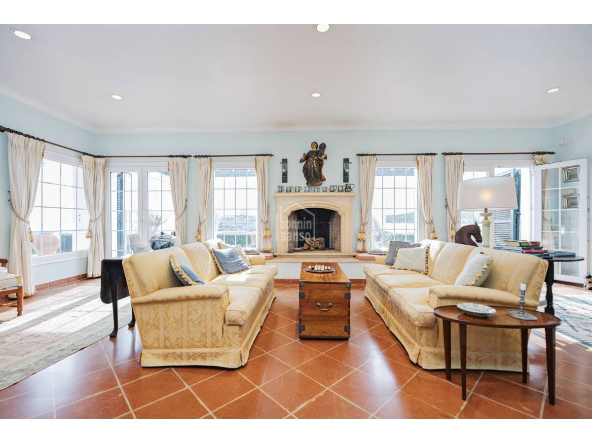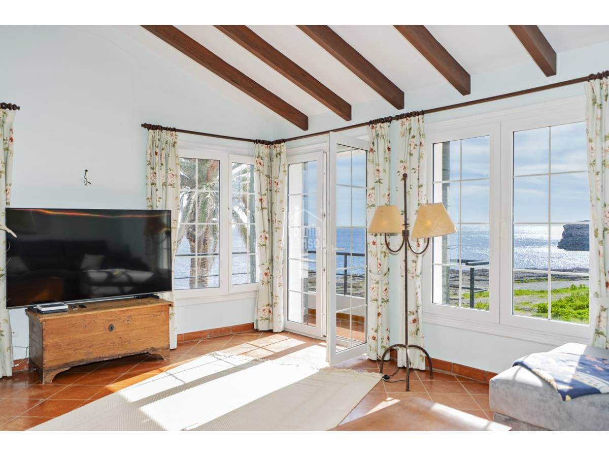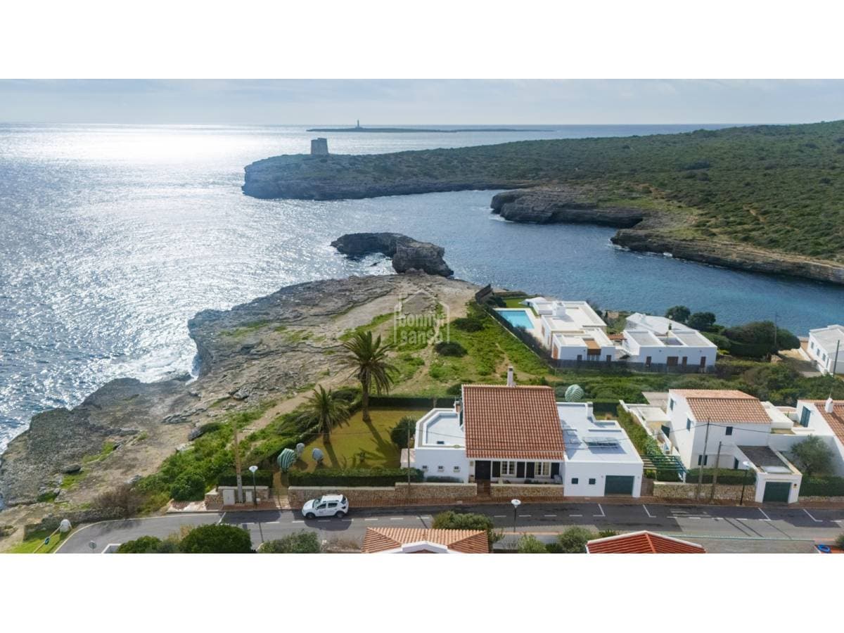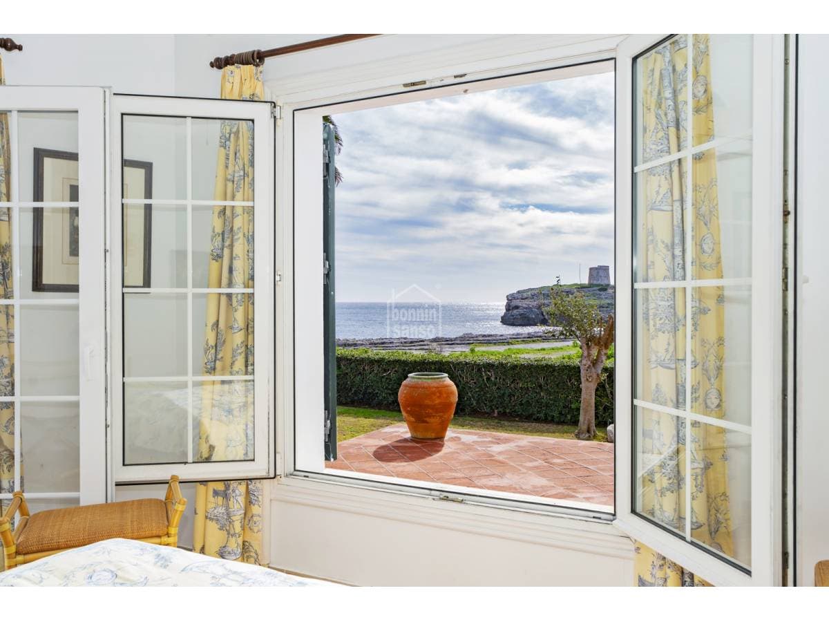 Set in a truly exceptional position on the water's edge, this elegant villa is located on a quiet road in the idyllic fishing village of Alcaufar, one of Menorca's most unspoilt coastal enclaves. A gentle stroll of just a few minutes leads to the local beach, where crystal-clear waters and white sand create a setting of natural beauty, complemented by charming seafront eateries that preserve the village's authentic character. The villa is beautifully maintained and thoughtfully designed to make the most of its privileged surroundings. Every room enjoys uninterrupted sea views, fostering a constant connection with the Mediterranean landscape. Natural light and coastal panoramas flow effortlessly throughout the interior. The front door opens into a spacious, light-filled living room, centred around a welcoming fireplace and enhanced by a sweeping staircase rising to the upper floor, creating an immediate sense of elegance and grandeur. Also on this level are two generous double bedrooms. One features a dressing room and en-suite bathroom, while the second offers fitted wardrobes, an en-suite bathroom and direct access to the garden. The upper floor is dedicated to comfort and privacy, comprising a substantial private lounge and an impressive principal suite. This expansive bedroom includes an en-suite bathroom and access to terraces from which panoramic sea views can be enjoyed in complete tranquillity. Additional features include a garage, workshop, utility room and air conditioning throughout. The garden provides ample space for the construction of a swimming pool, perfectly complementing the outdoor lifestyle and remarkable coastal setting. During the summer months, the panorama becomes particularly enchanting, as sailing boats glide gracefully in and out of the bay, adding gentle movement and colour to an already captivating scene. A rare opportunity to acquire a distinguished coastal residence in one of Menorca's most charming and exclusive seaside villages—where elegance, authenticity and location combine in perfect harmony.