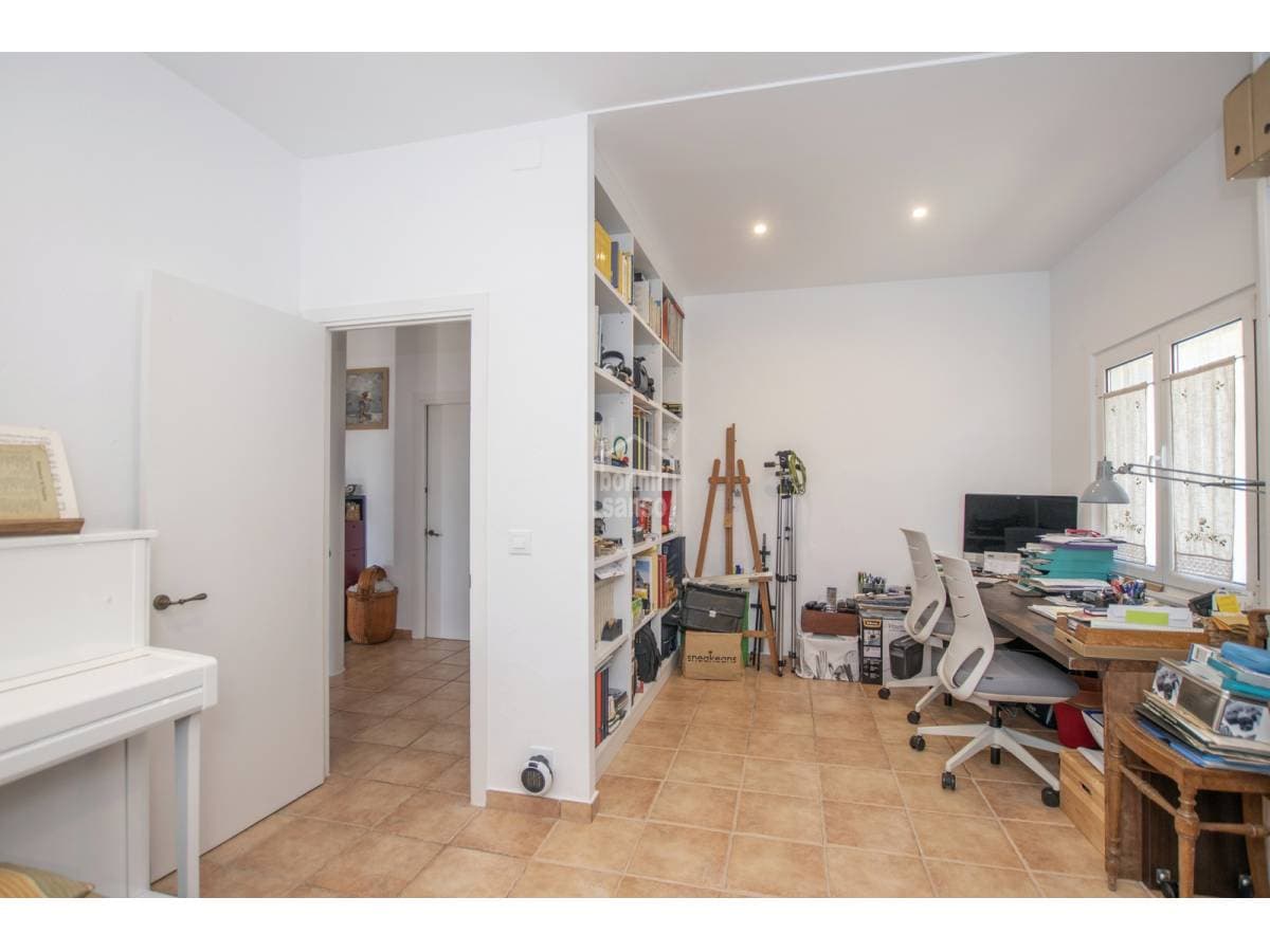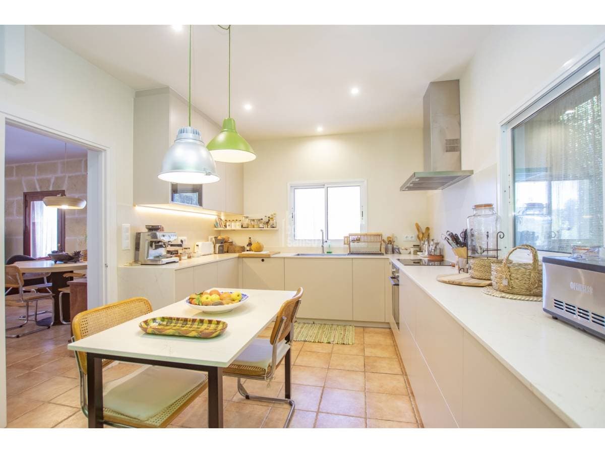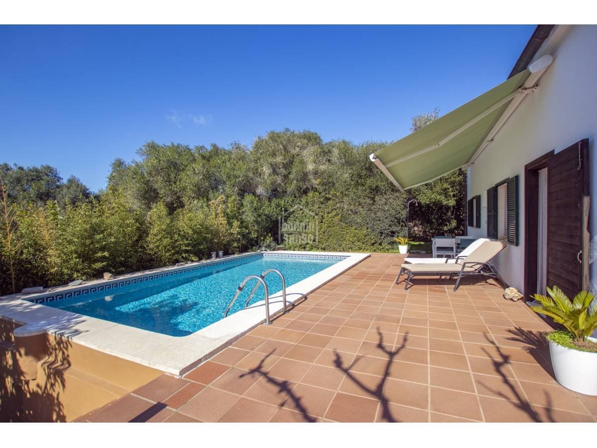 Set within the serene and residential enclave of La Argentina, in the heart of Menorca, this captivating property enjoys a strategic position between Mahón and Alaior. A privileged setting that perfectly balances countryside tranquillity and greenery with easy access to urban amenities. The property occupies an expansive plot of approximately 4,000 m², meticulously landscaped and thoughtfully designed. It features mature gardens with native vegetation and fruit trees, areas dedicated to home cultivation and a small chicken coop, all seamlessly integrated into the natural surroundings. An independent auxiliary guest building provides versatile additional living space, comprising two bedrooms, a living area, bathroom and kitchen—ideal for hosting guests, accommodating family members or for alternative uses. Several further outbuildings, a covered vehicle porch and a variety of outdoor areas enhance both functionality and harmony. A true haven of peace and wellbeing, immersed in nature and far removed from urban noise. The main house, generous and highly practical, is arranged on a single level for everyday comfort. An inviting entrance porch leads into a spacious open-plan living and dining area, complemented by a modern, fully separate kitchen. The sleeping quarters comprise two well-proportioned bedrooms—originally three and combined to create greater volume—and two bathrooms, one of them en suite. Quality finishes, an efficient layout and overall practicality make the property equally suited as a permanent residence or a refined holiday retreat. Outdoors, the property offers ample terraces, a superb saltwater swimming pool and a variety of relaxation areas, along with barbecue and storage spaces, all enjoying open, panoramic views over the surrounding area. Its elevated position ensures impressive vistas while maintaining a high degree of privacy. Significant investment has been made in energy efficiency, resulting in a near self-sufficient home in terms of electricity consumption, thanks to a modern solar panel system with battery storage. Air conditioning and an aerothermal system for hot water and radiators further enhance year-round comfort and sustainability. A distinctive property, ready to move into and enjoy.