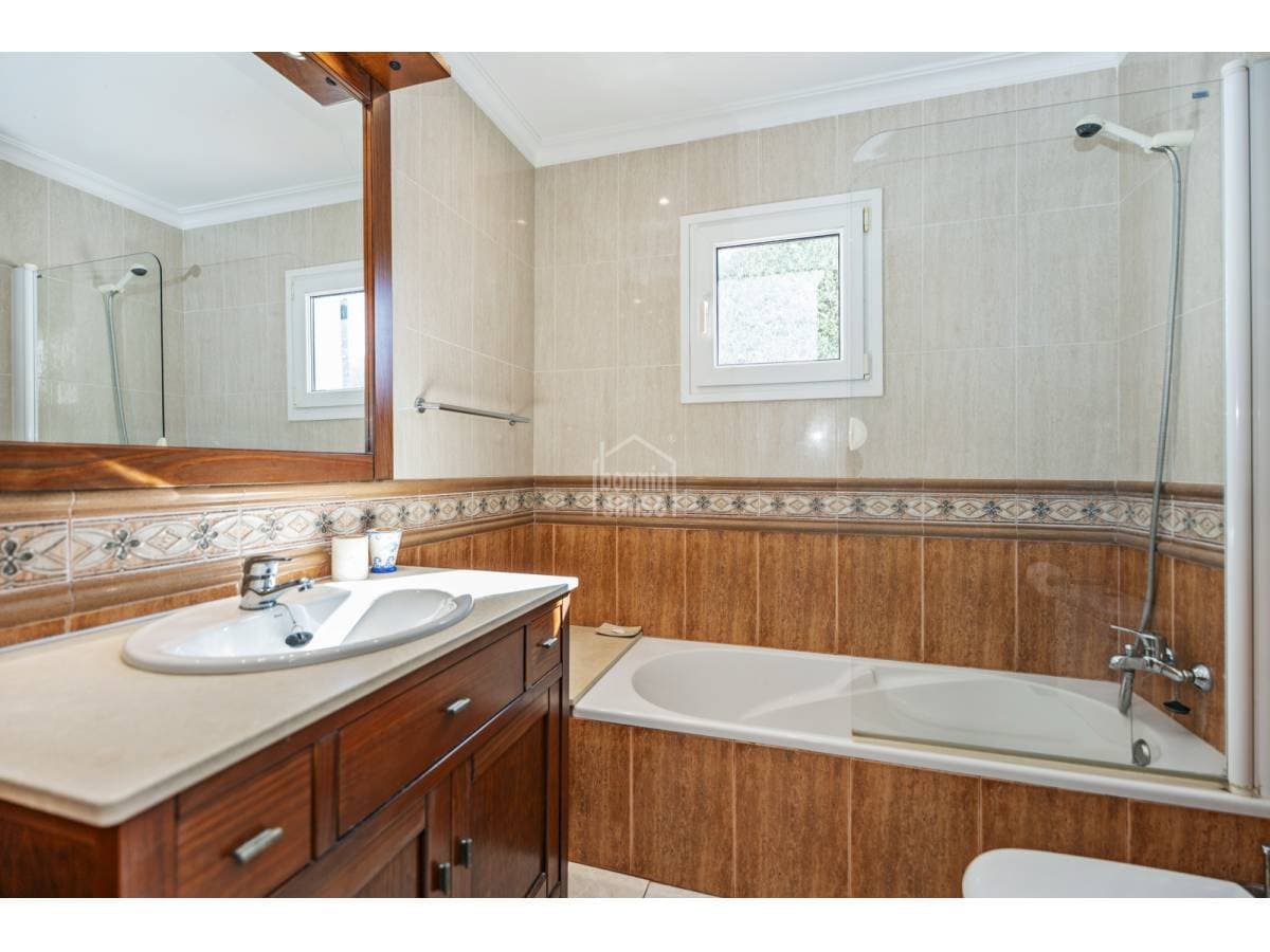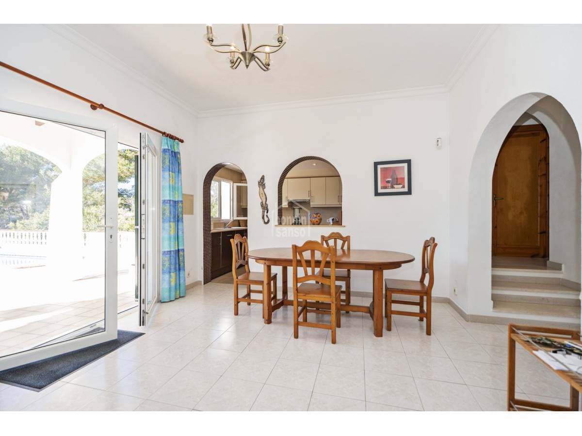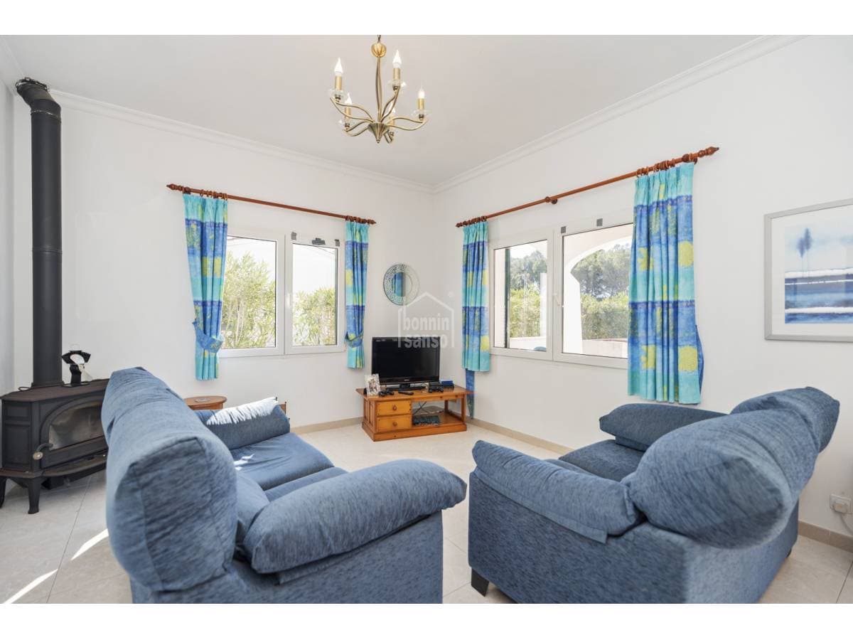 Exclusively listed, this charming villa in Son Parc combines comfort, space and a privileged setting. Arranged entirely on one level, it offers a practical and comfortable lifestyle, ideal as a permanent residence or a holiday home. The house features three bedrooms and two bathrooms, thoughtfully designed to ensure everyday comfort. The spacious living and dining area with fireplace forms the heart of the home, creating a warm and inviting atmosphere. The large, separate kitchen is both practical and bright. The exterior areas are designed for enjoying the Mediterranean lifestyle, featuring a pleasant terrace, private swimming pool and a well-kept garden, ideal for relaxing and entertaining. The property also includes a garage, providing convenience and additional storage space. Thanks to its excellent orientation, the house benefits from abundant natural light throughout the day, enhancing the sense of space and wellbeing. Located in a quiet and highly sought-after area, it is within a short distance of the golf course, beautiful beaches and the port of Addaya, offering an ideal balance between nature, leisure and amenities. An excellent opportunity to acquire a property in one of Menorca's most desirable locations.