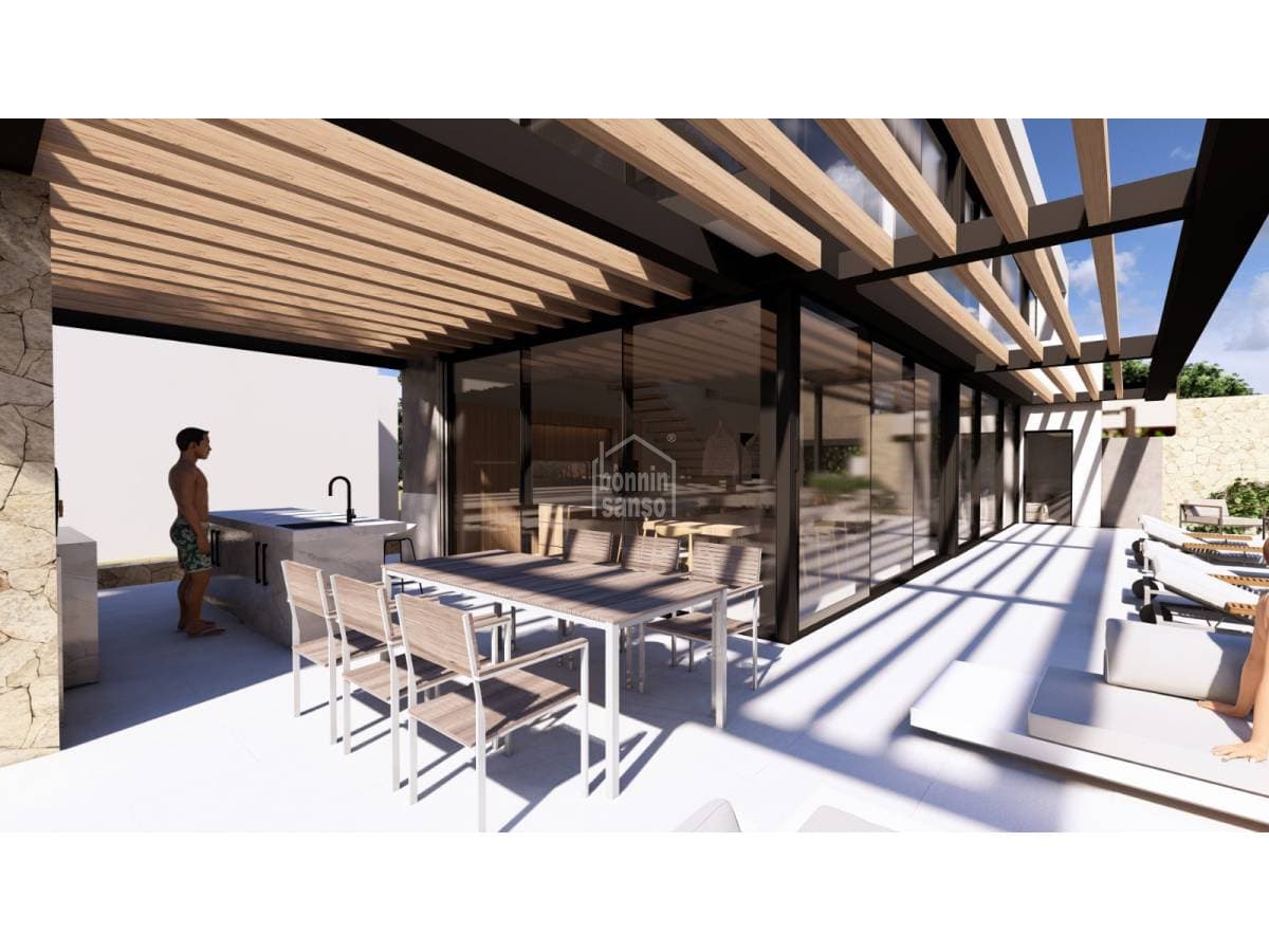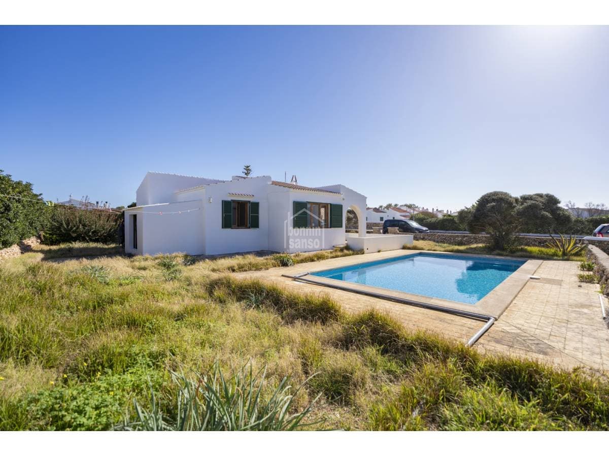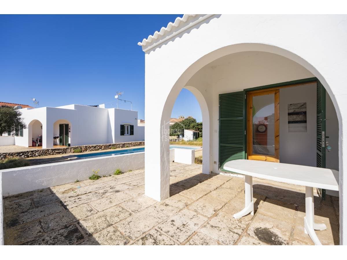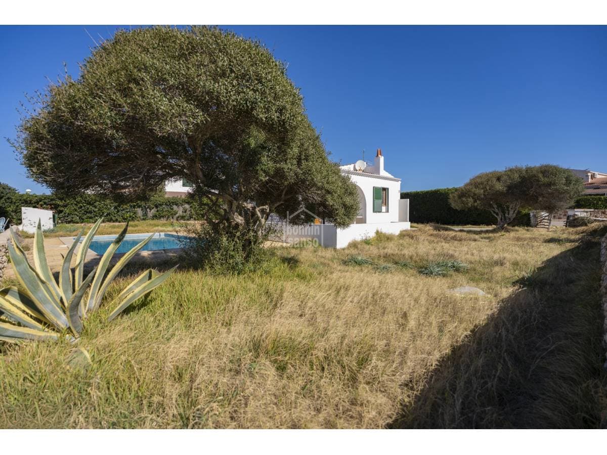 Located in a quiet residential area of Cap d'Artrutx, just a short distance from the sea and the picturesque lighthouse, this charming detached villa sits on a generous 631 m² plot. With a built area of 68 m², the property combines Mediterranean character with a privileged natural setting. The accommodation comprises three bright bedrooms, a family bathroom, a cosy living–dining room, and a functional fully fitted kitchen. Outside, a spacious terrace provides the perfect setting to enjoy Menorca's excellent climate all year round — ideal for al fresco dining, family gatherings, or simply relaxing in the sun. The private garden surrounding the house offers numerous possibilities and features a private swimming pool, perfect for cooling off during the warmer months and enjoying leisure time in complete privacy. In addition, the property includes an architectural project with renderings for the construction of a luxury villa, enhancing its appeal for those wishing to renovate or extend, as well as for investors seeking a prime development opportunity in one of the island's most sought-after locations. For further information or to arrange a viewing, please do not hesitate to contact us.