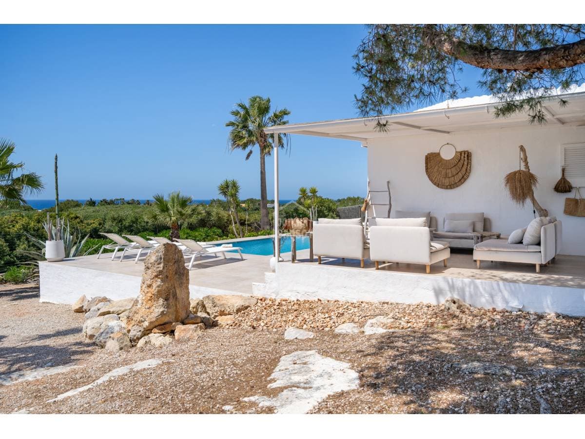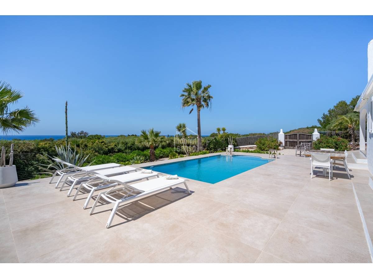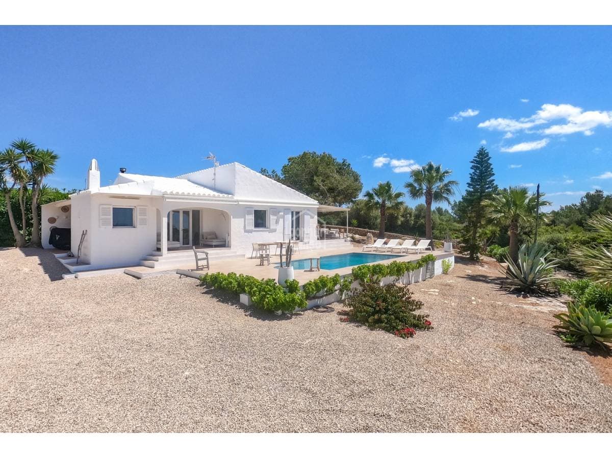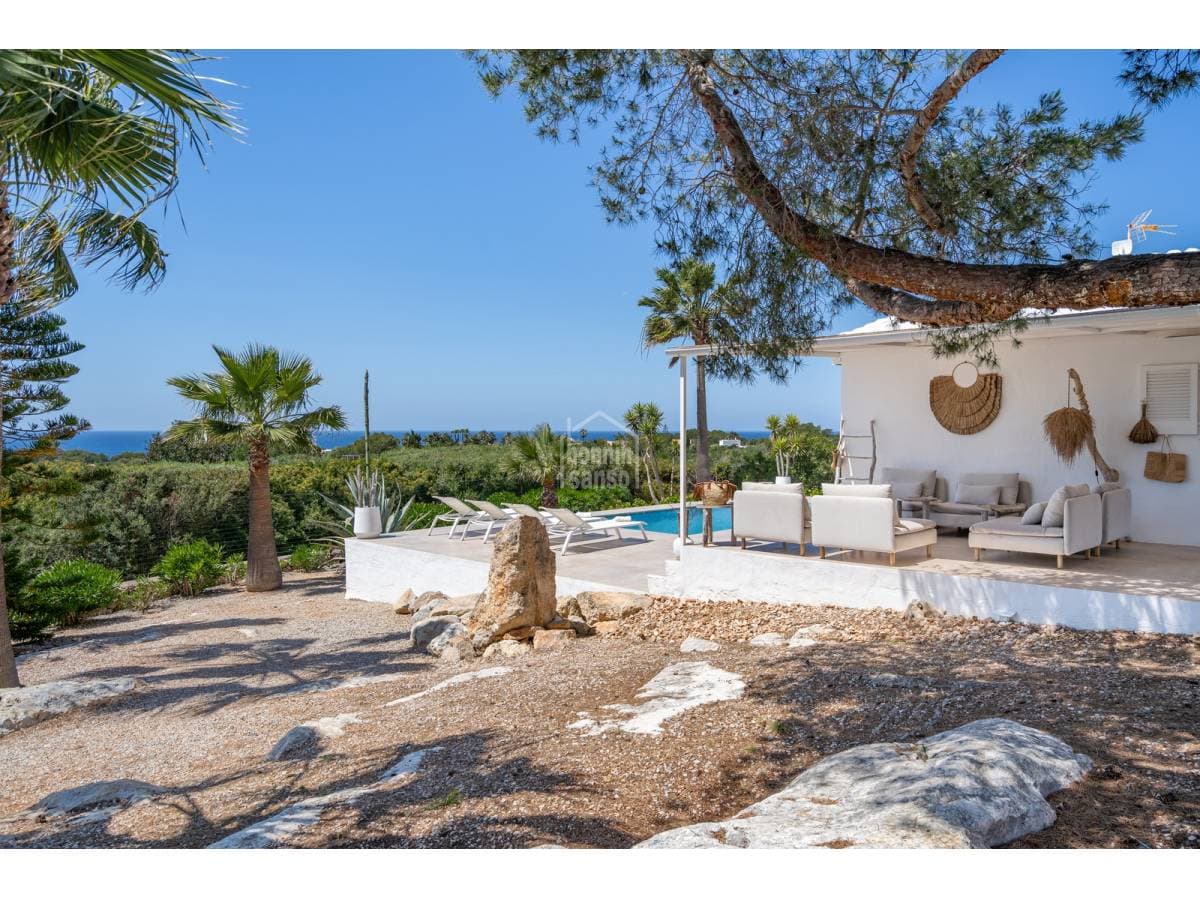 Set in a prime location, surrounded by peace and nature, this charming villa enjoys spectacular sea views and lies just a few minutes from the crystal-clear waters of Binisafúa and Caló Blanc. The property stands out for its Mediterranean character, with an exterior thoughtfully designed for relaxed living. It features inviting outdoor seating areas, a welcoming porch and charming spaces for al fresco dining beneath the trees, perfect for long summer evenings. The pool, ideally positioned to enjoy some of the island's finest sunsets, is truly exceptional. Inside, the home conveys warmth and harmony through soft tones, natural materials and a comfortable, well-balanced layout. The open-plan living and dining area incorporates a fully integrated kitchen. There are three bedrooms and two bathrooms, one of them en suite to the principal bedroom. A home designed to embrace the authentic Menorcan lifestyle, ideal both as a second residence and for year-round living.