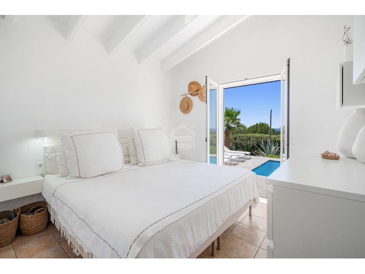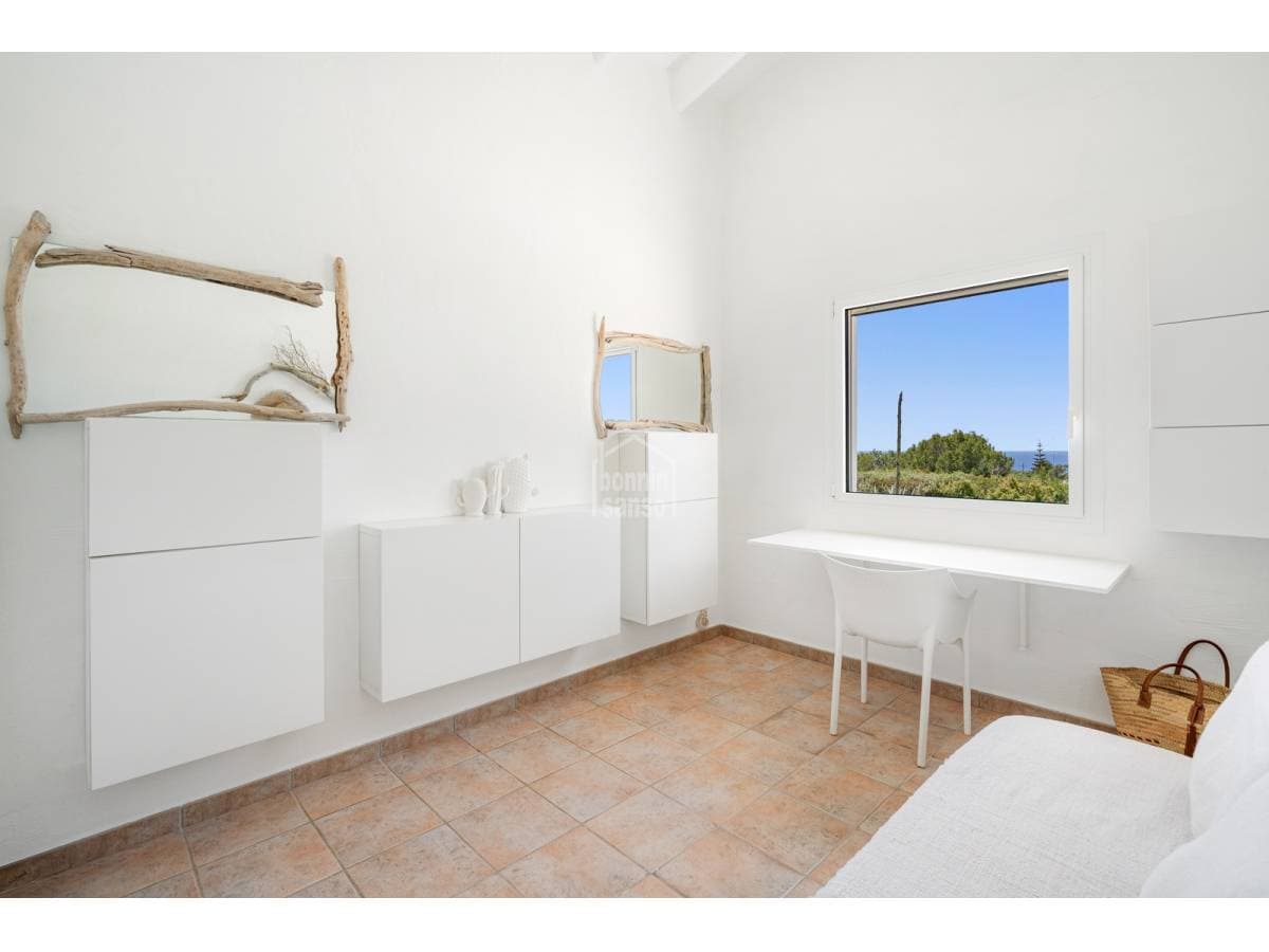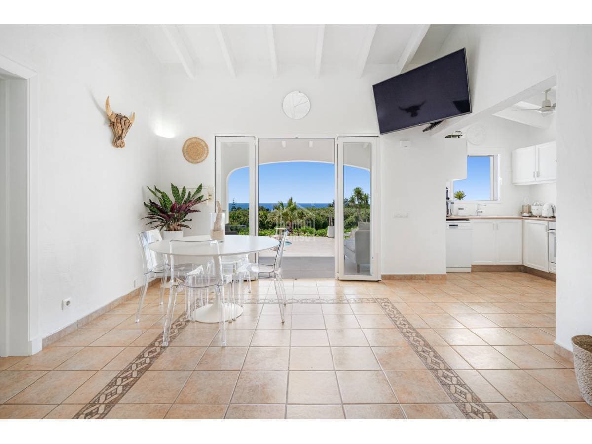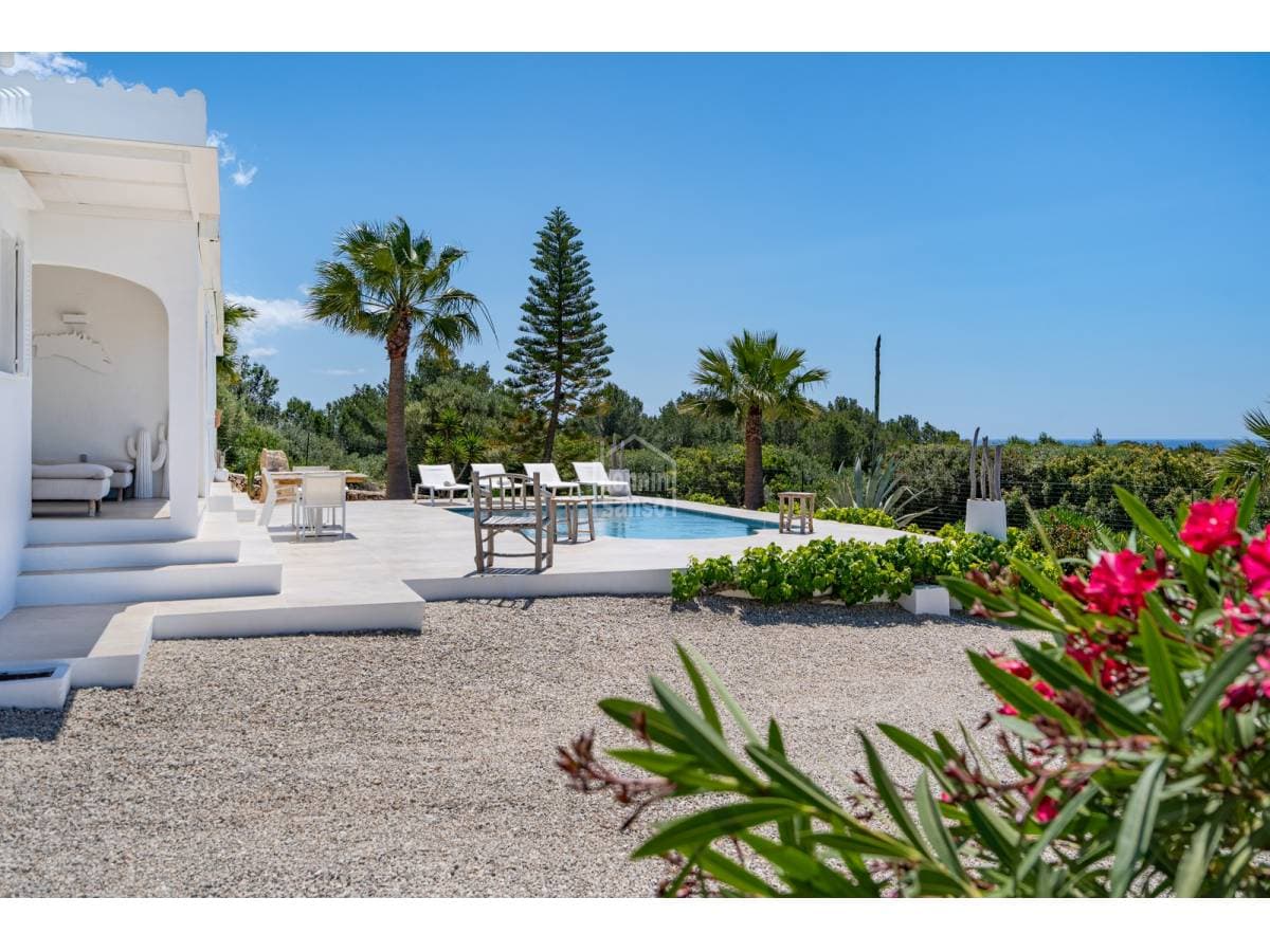 Set in a prime location, surrounded by peace and nature, this charming villa enjoys spectacular sea views and lies just a few minutes from the crystal-clear waters of Binisafúa and Caló Blanc. The property stands out for its Mediterranean character, with an exterior thoughtfully designed for relaxed living. It features inviting outdoor seating areas, a welcoming porch and charming spaces for al fresco dining beneath the trees, perfect for long summer evenings. The pool, ideally positioned to enjoy some of the island's finest sunsets, is truly exceptional. Inside, the home conveys warmth and harmony through soft tones, natural materials and a comfortable, well-balanced layout. The open-plan living and dining area incorporates a fully integrated kitchen. There are three bedrooms and two bathrooms, one of them en suite to the principal bedroom. A home designed to embrace the authentic Menorcan lifestyle, ideal both as a second residence and for year-round living.