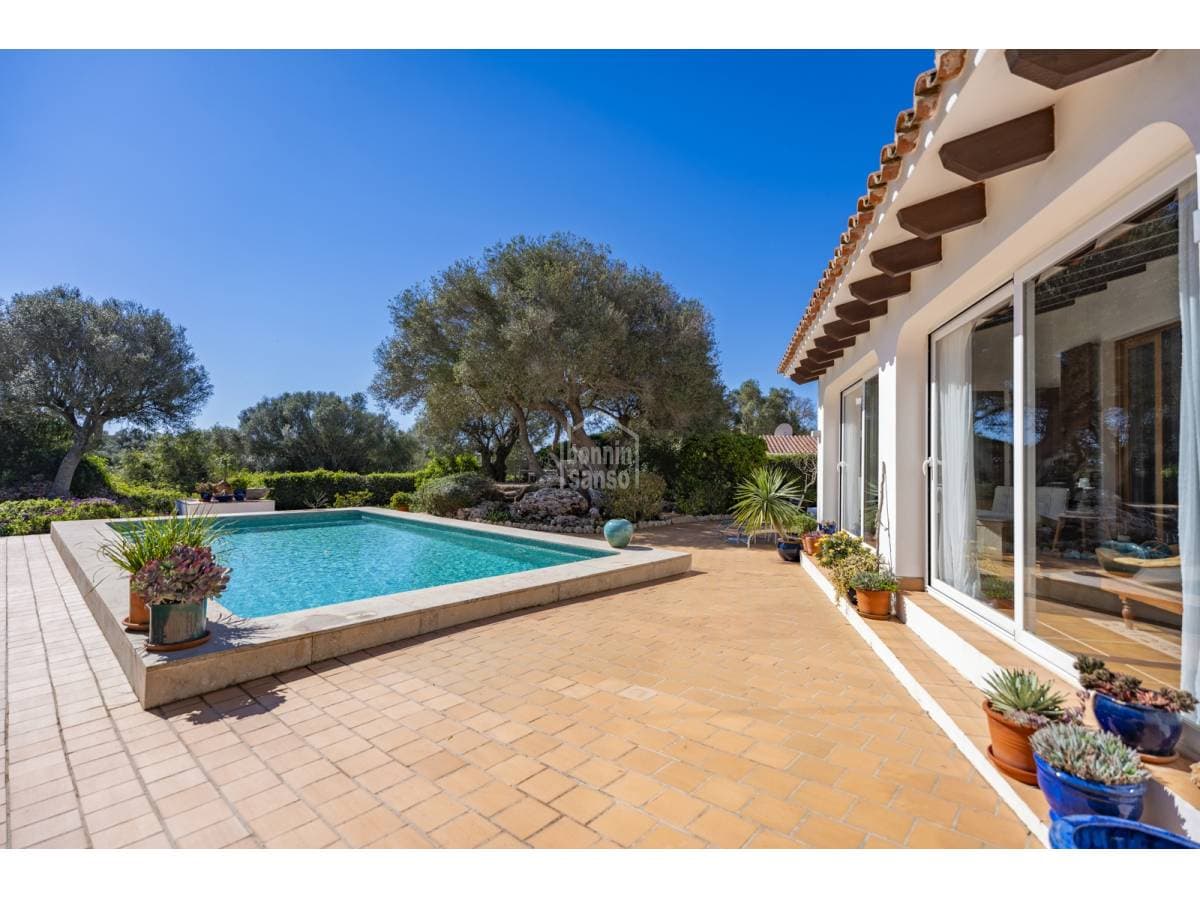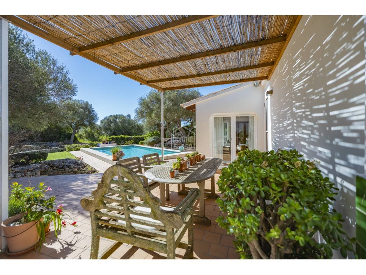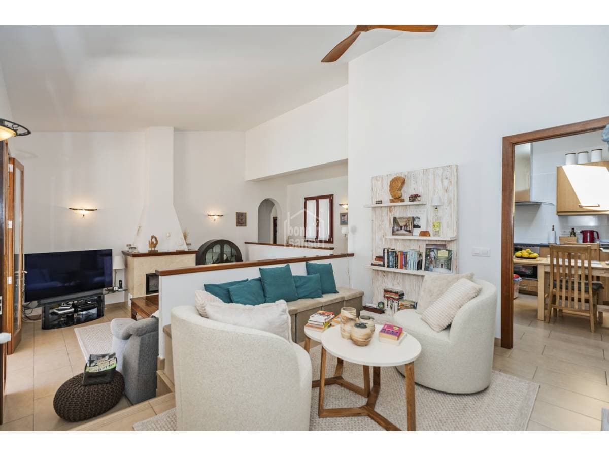 Set in a tranquil and well-established residential area in Binixica, this elegant single-level residence enjoys a privileged south-east orientation, allowing for abundant natural light throughout the day. Offering privacy and a calm atmosphere, the property has been carefully designed both as a holiday home and as a comfortable, efficient residence for year-round living. The accommodation comprises four well-proportioned bedrooms and two bathrooms, arranged within a balanced and practical layout. The generous kitchen is well suited to everyday use, while the integrated garage adds convenience. A split-level living and dining area creates distinct yet connected spaces, enhancing both character and a sense of openness. This is complemented by a second living area set within a covered terrace, a versatile space suitable for use throughout the year. The exterior areas are a key feature of the property. The landscaped garden, well maintained, includes mature Mediterranean planting and attractive century-old olive trees, providing natural shade and a pleasant setting. Open views further enhance the sense of space and tranquillity, creating an ideal environment for those seeking privacy and a connection with nature. With an Energy Performance Rating of A, the property offers efficiency, thermal comfort and sustainability, making it an excellent option as a permanent residence.