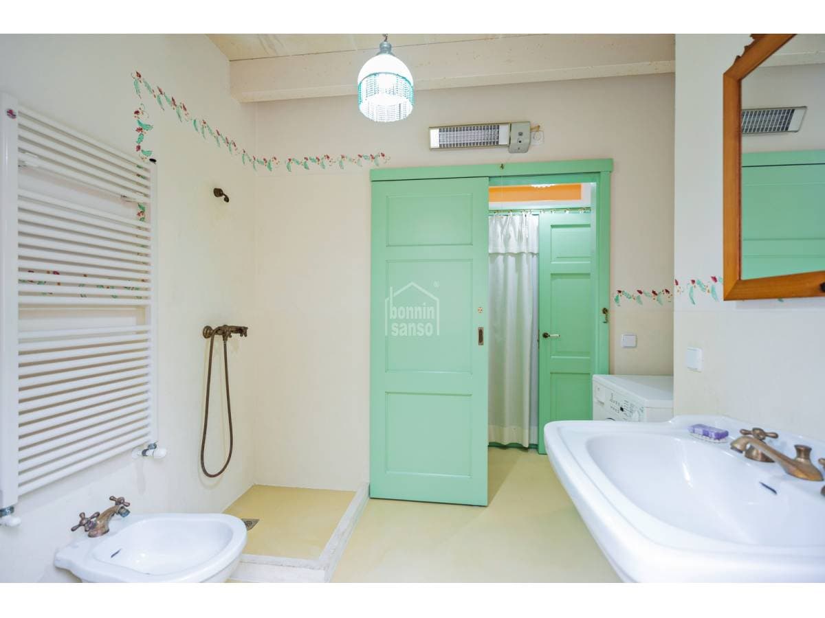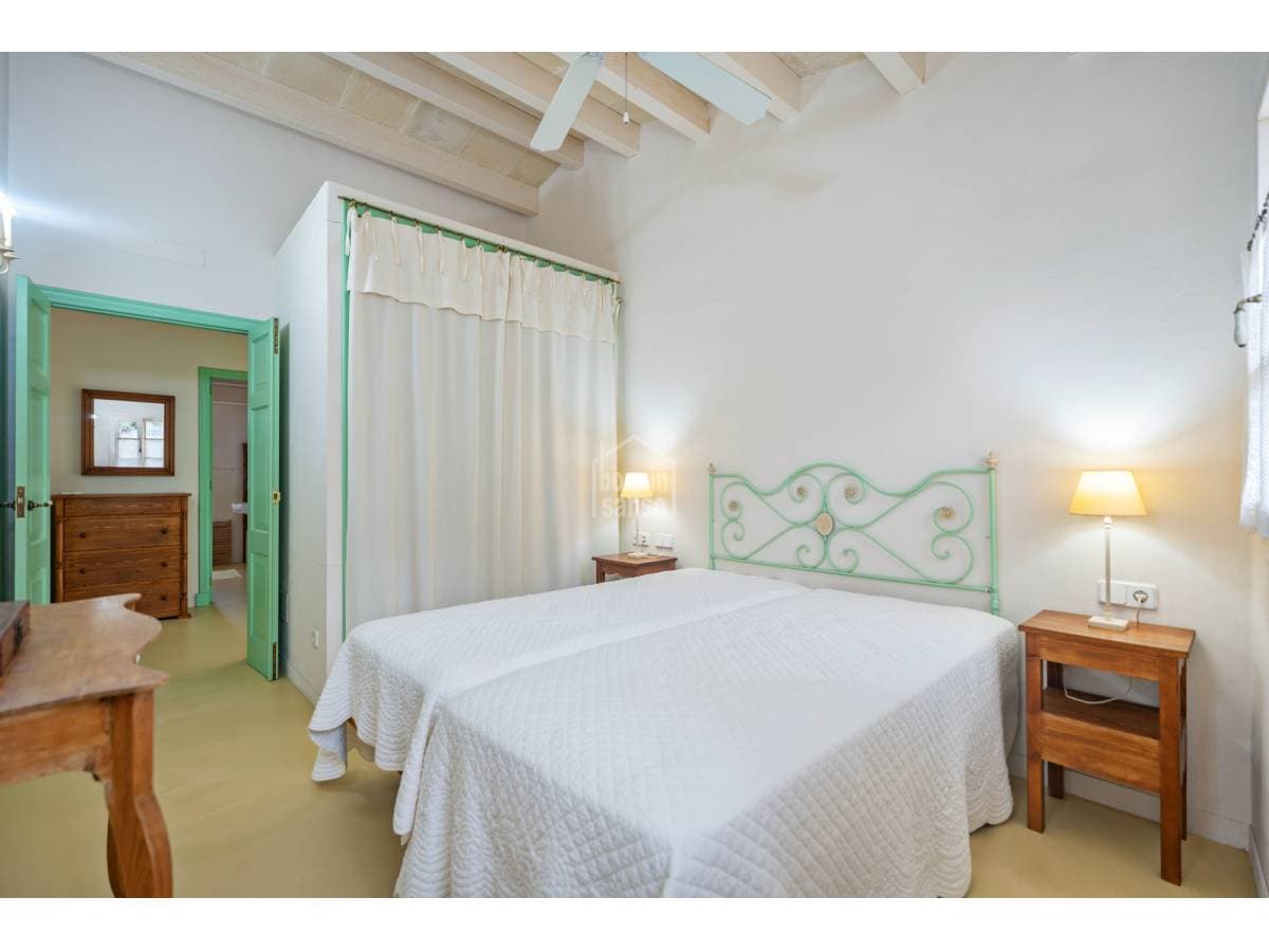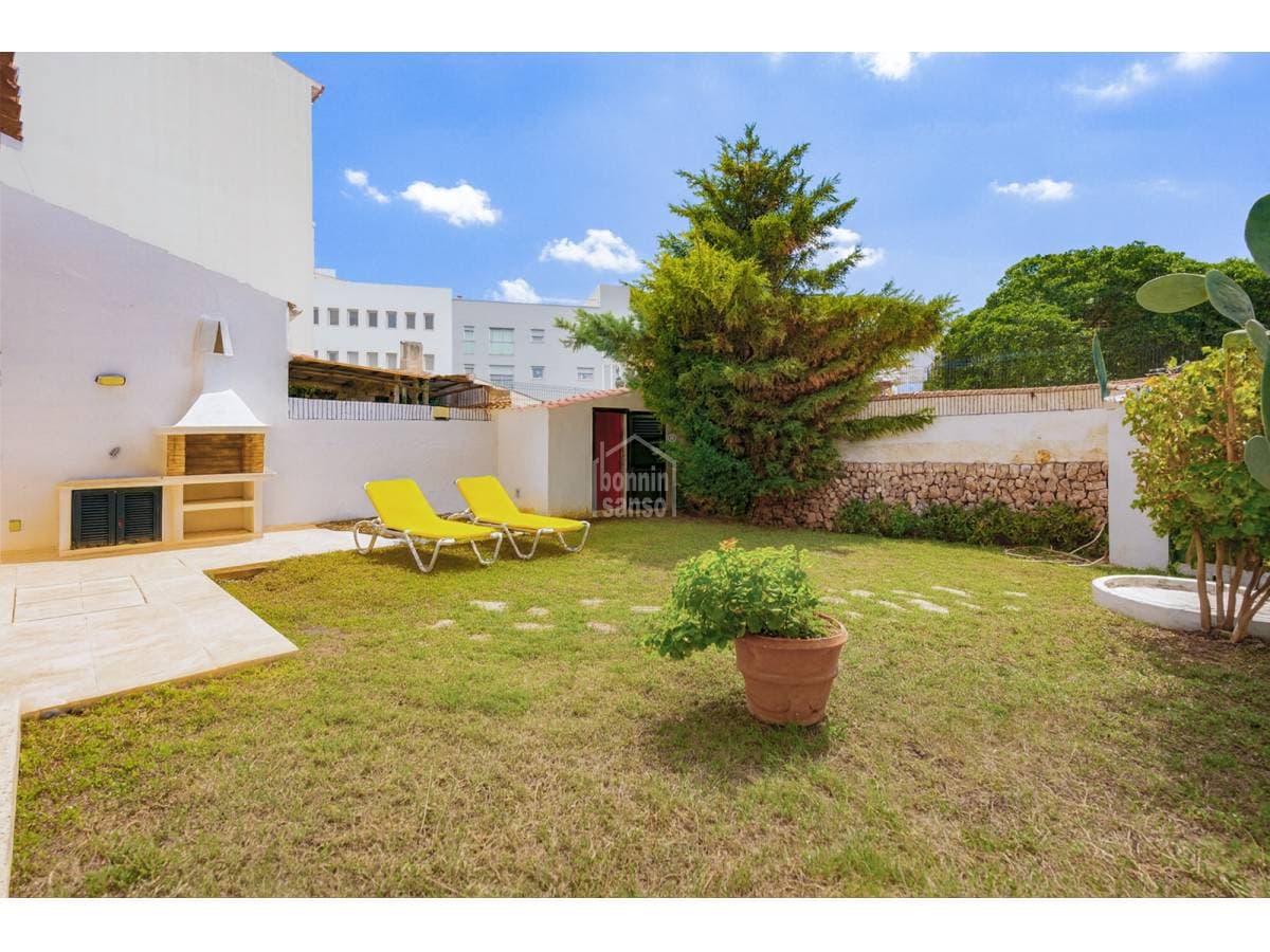 Just a few metres from Plaza Explanada lies this beautiful Menorcan house, completely renovated and extended in 2006, preserving all its traditional character while adding comfort and style. Distributed over the ground floor and first floor, the property is immaculate, very well maintained and is sold fully furnished, ready to enjoy from day one. Upon entering, the home immediately impresses with its warm and welcoming atmosphere. A lovely living room with fireplace leads naturally into the spacious kitchen with dining area, a bright and practical space ideal for family life and gatherings with friends. Both the kitchen and the living room offer direct access to the porch, a perfect spot to relax outdoors all year round, whether on quiet winter mornings or pleasant summer evenings. The porch opens onto the beautiful private garden, an intimate space with a barbecue, ideal for enjoying special moments. This floor also features a full bathroom, a laundry area and a practical storage/pantry room. A stylish staircase leads to the first floor, where a large terrace overlooking the garden awaits. Here you will find two bright double bedrooms and two full bathrooms. The main bedroom stands out with its en-suite bathroom and a useful area that can be used as a dressing room or storage space. The house preserves the authentic Menorcan charm, with exposed beams and marés stone details that give character and personality to every room. For added comfort, the property is equipped with oil-fired central heating and air conditioning in the night area, ensuring year-round well-being.